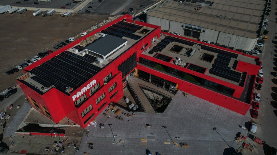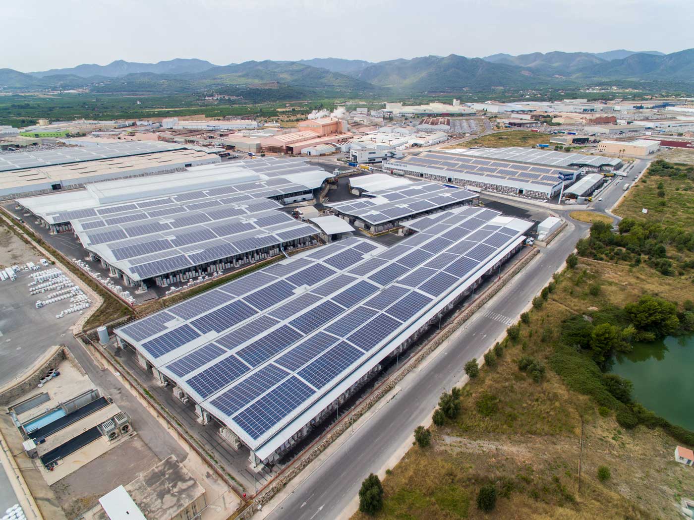 Pamesa Cerámica is home to the largest photovoltaic self-consumption installation in Europe, with a total power of 13,168 kWp and more than 39,900 solar panels installed in its three logistics centers. With a covered area of 77,000 m², this infrastructure generates 13,292 MWh per year, preventing the emission of 14,076 tons of CO₂ and contributing to overall energy savings of more than 4.4 million kWh. A benchmark in sustainability within the ceramic sector. The largest photovoltaic self-consumption installation in Europe with 13,240 kWh